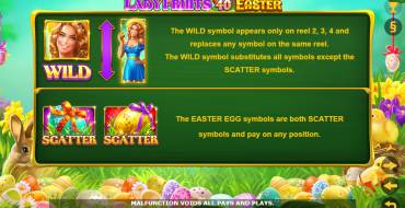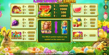 Слот Lady Fruits 40 Easter от провайдера Amatic Industries имеет поле вида 5х4. Выплаты производятся по 40 игровыми линиям.
