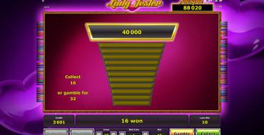 В игровом аппарате Lady Jester пять барабанов. Когда они пребывают в статичном положении, в каждой колонке видны по четыре картинки (всего двадцать на экране). Количество активных полос вы определяете сами. Их может быть до сорока. На них разрешается делать равные ставки. Диапазон следует уточнять в казино. Например, в StarGames на полосу принимается от одного до двухсот пятидесяти кредитов (1 – 10000 на раунд). В слоте есть простые символы, джокеры, скаттеры, накопительные джекпоты, игра на удвоение и бесплатные вращения с особыми условиями. Стандартные картинки составляют выигрышные цепочки только слева направо на задействованных линиях. Последовательности формируются из двух или трех и более одинаковых элементов. В одном спине могут быть многочисленные комбинации, но с каждой полосы начисляется лишь максимально возможный выигрыш. Его размер определяется умножением ставки по одной линии на коэффициент от х2 до х2000. Все множители перечислены в таблице. Об исключениях и особых правилах читайте далее. Все начисленные деньги можно сразу вывести на счет или рискнуть ними в игре по равным шансам. Она происходит в классической форме движения по ступенькам лестницы. На каждом этапе выплата может либо удвоиться, либо уйти в кассу заведения. Выходить разрешается на любом шаге. О лимитах читайте в справочном разделе.