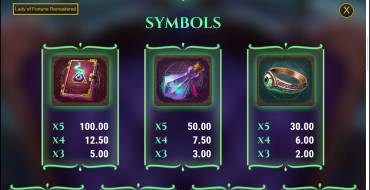 Игровое поле в Lady of Fortune Remastered состоит из 5 барабанов, в 3 ячейки высотой каждый. Для составления комбинаций используется 15 фиксированных линий. Ставка выбирается среди готовых вариантов в диапазоне от 0.15 до 60 евро, но он может быть увеличен исходя из целевой аудитории казино. Всего во вращениях барабанов принимают участие 7 обычных и 2 специальных знака. Фриспины в слоте отсутствуют, их заменяет бонусная игра "Угадай карту" с моментальными выплатами.