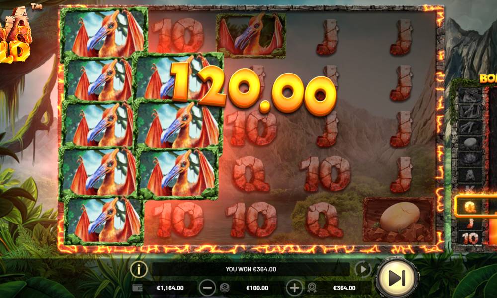 В мае 2021 года провайдер Betsoft презентовал игровой автомат с кластерной механикой выплат — Lava Gold. В этом слоте мало бонусов, но много выигрышей, которые постепенно собираются и пополняют счет пользователя. Меня впечатлила анимация и четкая проработка деталей. В онлайн слоте действительно ощущаешь себя у подножия вулкана, извержение которого вот-вот начнется. Тематика автомата — доисторические времена, поэтому в небе летают птеродактили, а по барабанам ходит тиранозавр. Игру сопровождает рев динозавров и звуки потока лавы.