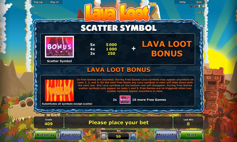 Lava Loot – Начинаются десять бесплатных вращений, во время которых ставку прежнего размера за клиента делает заведение. В них на трех средних барабанах появляются стекированные символы Wild в виде потоков лавы. Они участвуют в формировании комбинаций. Скаттеры здесь появляются лишь на первом и пятом барабанах. Два таких символа продлевают раунд на десять фри-спинов.