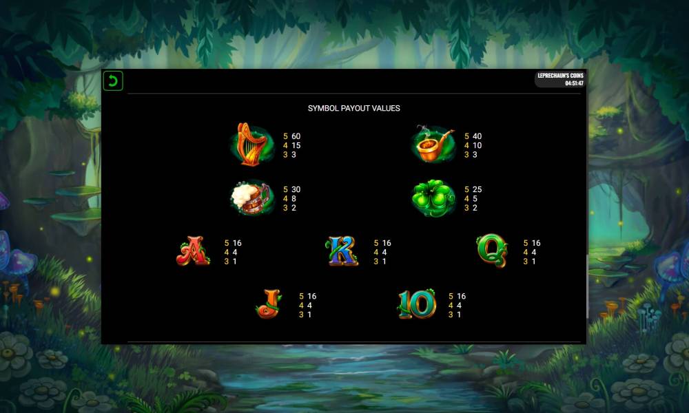 Слот Leprechaun's Coins от провайдера Platipus имеет самое стандартное игровое поле, которое состоит из 5 барабанов по 3 символа. Выплаты производятся по 243 активным игровым линиям.