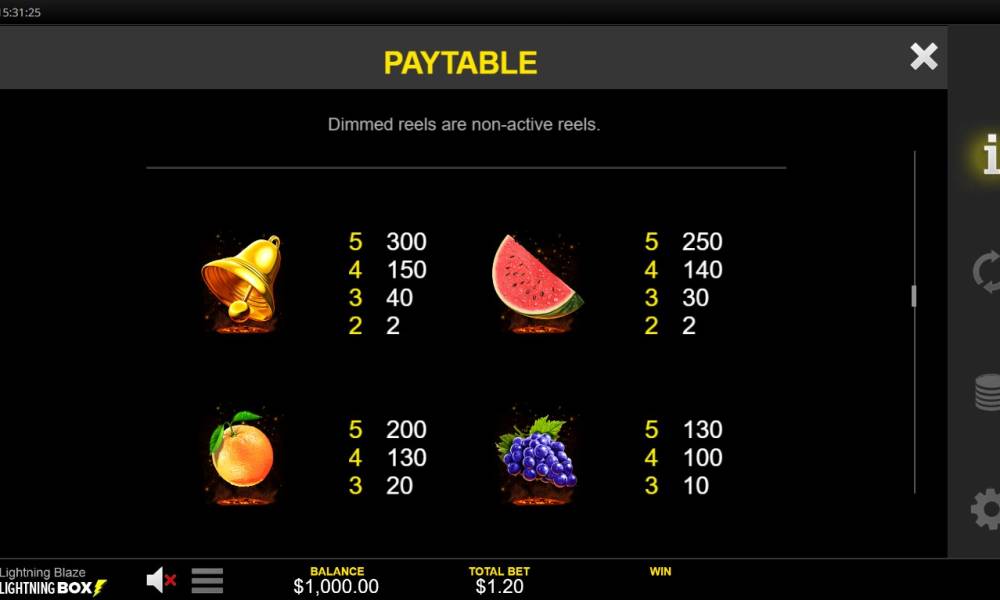 Игровой автомат Lightning Blaze — это классика жанра. Фрукты, колокольчики и семёрки постоянно мелькают на пяти барабанах. Выигрыш пользователь получает собрав от трех до пяти одинаковых символов на линии. Исключение знак семёрки, дающий приз от двух штук. В слоте 40 фиксированных линий, на каждую из которых можно делать ставку от 0.4 до 100 у.е. Провайдер добавил в автомат раунд бонусных вращений и несколько специальных знаков. Также есть Multiplier и джекпоты.