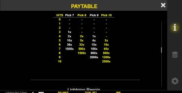 Игровое поле представлено квадратами 8×10, в которых расположены цифры от 1 до 80. Ставка на одно число в раунде может быть от 0.5 до 62.5. Игроку нужно выбрать от трех до десяти произвольных цифр самостоятельно или предоставить выбор компьютеру кнопкой «Quick Pick». Сумма выигрыша зависит от того, сколько цифр сыграло (всего выпадает вверху 20 вариантов), ведь в зависимости от этого применяется множитель (до х2500). Посмотреть значения можно в меню слота в таблице выплат.