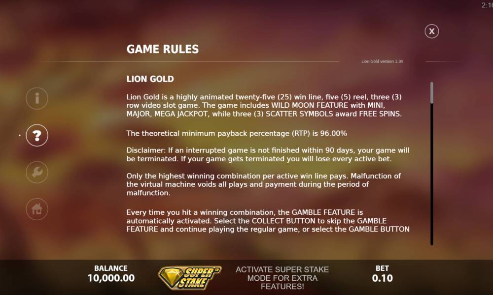 Игровой автомат Lion Gold Super Stake Edition от провайдера Spinomenal посвящен повелителю зверей – льву. Если вам улыбнется удача, то здесь вы сможете выиграть крупные призы, вплоть до 5300 ставок.