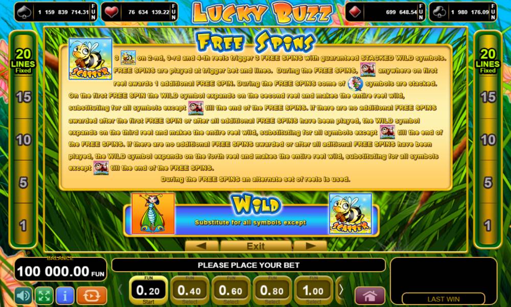 На пяти барабанах располагаются мультяшные насекомые и обозначения карт. Символы из первой группы (5 штук) — это дорогие, а из второй (4 вида) — дешевые. В слоте Lucky Buzz предусмотрено 20 фиксированных линий для выплат. Комбинации на них составляются слева направо от трех символов. И только самый дорогой знак — муравьиха с розовым цветом — оплачивается от двух штук. На спин можно ставить от 20 до 10000 монет, номинал которых нужно узнать в казино. Игра предполагает максимальный выигрыш х1000 от ставки.