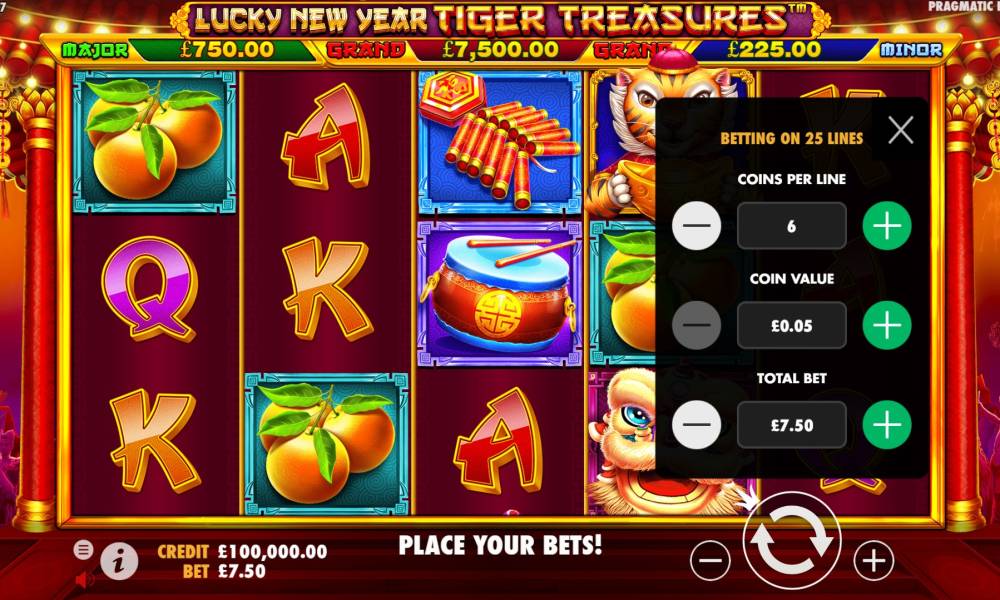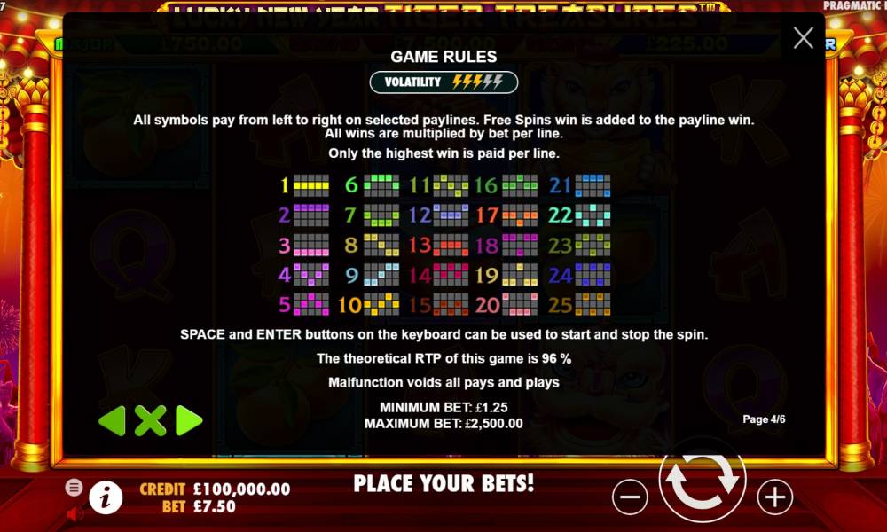 Игровой автомат Lucky New Year Tiger Treasures от провайдера Pragmatic Play имеет стандартное игровое поле вида 5x3. Выплаты производятся по 25 линиям.