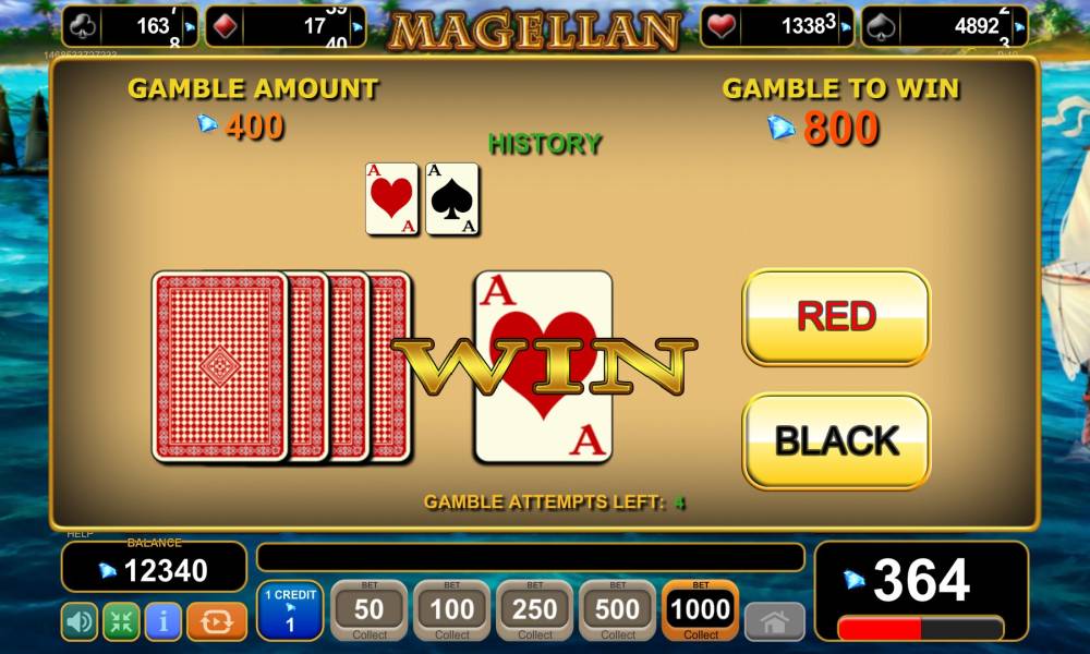 Видео-слот «Магеллан» имеет пять барабанов с разнообразными картинками, необходимыми для составления оплачиваемых последовательностей. Играть на аппарате можно по одной, десяти, двадцати, тридцати или пятидесяти активным полосам, сделав на них одинаковые ставки. На каждую линию принимается одна, две, пять, десять или двадцать чипов. Какой может быть стоимость фишек, уточняйте непосредственно в интернет-казино, потому что лимиты определяются правилами заведения. При неподвижных барабанах вы увидите на экране сразу двадцать картинок (5х4). В Magellan есть простые картинки, джокеры, скаттеры, фри-спины, накопительные джекпоты и раунд игры на удвоение выплаты. Стандартные изображения составляют выигрышные цепочки только на задействованных полосах. Непрерывные последовательности одинаковых картинок должны начинаться с первого барабана. Для расчета выплаты в каждом случае ставка по линии умножается на коэффициент от х5 до х1000, предусмотренный для сложившейся комбинации. В одном раунде допускаются многочисленные выигрыши, но с каждой полосы он начисляется лишь за наиболее ценный вариант. Получив выплату любого размера, клиент может начать игру по равным шансам. Здесь нужно угадывать цвет карты. Правильный ответ удваивает сумму, а ошибка означает ее проигрыш. Можно играть несколько раз подряд, но есть максимальный лимит выплаты.