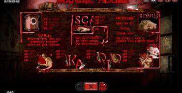 Игровой автомат Maniac House имеет пять барабанов, двадцать фиксированных полос и пятнадцать ячеек для символов на основном экране. На линии разрешается делать одинаковые ставки. Принимается до десяти монет каждую. Их номинал уточняйте в онлайн-казино. На сайте разработчика в демо-версии чипы могут стоить от одного цента до десяти долларов (0.20 – 2000 долларов на спин). В слоте доступны восемь базовых иконок, три особых символа, игра на удвоение, фри-спины с множителями и бонусный раунд. Обычные иконки составляют выигрышные цепочки из нескольких одинаковых элементов. Они должны расположиться непрерывной последовательностью на активной линии, начиная с первой колонки. Всегда учитывается только максимальный вариант по каждой полосе. Для расчета выплат используются коэффициенты от х2 до х10 000. Они умножаются на ставку по линии. Об исключениях читайте ниже в обзоре Maniac House. Если комбинаций больше одной, выигрыши суммируются. Раунд на удвоение запускается по желанию клиента. Его можно начать при любой выплате. На кон принимаются 100% или 50% начисленной суммы. Игра проходит в стиле сравнения карт. Победа над виртуальным дилером означает, что выигрыш удвоится. Проигрыш лишает ставки, а ничья оставляет стороны при своих. О бонусах рассказывается далее в статье.