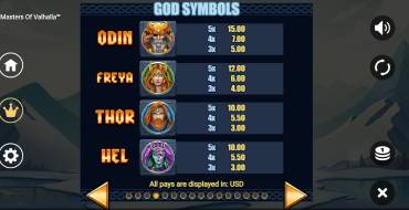 Выигрыши формируются при появлении одинаковых символов на соседних барабанах, начиная с левого края. Символы низкой стоимости представлены четырьмя рунами, дающими от 1,1x до 1,2x ставки за пять одинаковых символов. Премиальные символы включают Хель, Тора, Фрейю и Одина, приносящие от 2x до 3x за комбинацию из пяти.