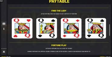Fortune Play. Этот раунд пользователь может активировать в любой момент, нажав на одноименную кнопку на главном экране. Его ставка повысится в 10 раз в зависимости от той, что была выбрана. Игрок получит 4 вращения, во время которых на третьем барабане будут появляться двойные символы креста и BAR. Вероятность выигрыша в этом раунде выше в два раза. В случае победы поиск Леди может принести до х10 от полученного приза.