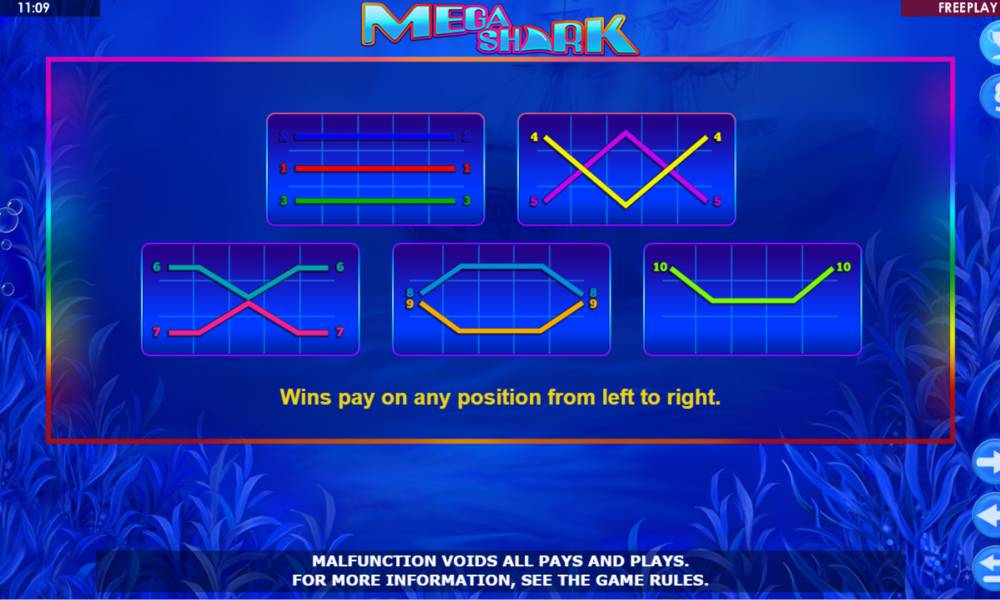 Игровое поле слота Mega Shark представлено сеткой 5х3 с 10 активными игровыми линиями.