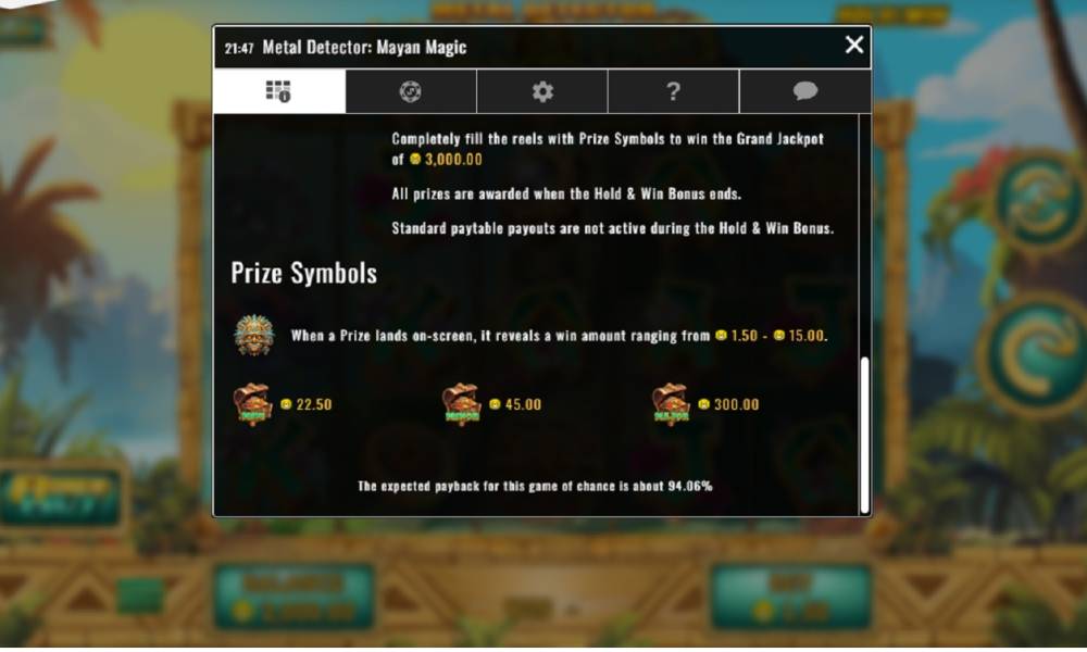 Mayan Magic Hold & Win – основной бонус слота, который существенно расширяет выигрышный потенциал игры. Три повторных вращения запускаются с помощью шести призовых символов в виде масок и сундуков с сокровищами, которые тут же фиксируются и открывают сокровища с множителями от 1x до ошеломляющих 10x или дают доступ к четырем джекпотам.