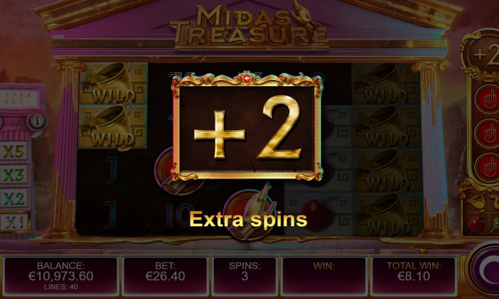 В Midas Treasure есть 3 вида вращений — простые, бесплатные и бонусные. Бесплатные можно выиграть или купить. Бонусные запускаются при накоплении нужного количества символов. Игра ведется на поле 5х4. Выплаты складываются по 40 фиксированным линиям слева направо (в бонус-раунде — не по линиям, а за количество накопленных символов). Гемблер может выбрать ставку в диапазоне от 0.40 до 100 и выиграть не более чем х1000. Максимальную выплату можно поймать только в бонус-раунде.