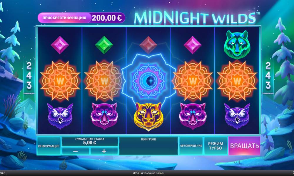 Игровой автомат Midnight Wilds от провайдера Playtech посвящен северной природе. Если вы достаточно подготовлены к суровым морозам, то в этом слоте вас ждут крупные выигрыши, вплоть до 5500 ставок. В этом вам помогут особые функции, включая покупной бонус и режим бесплатных вращений.