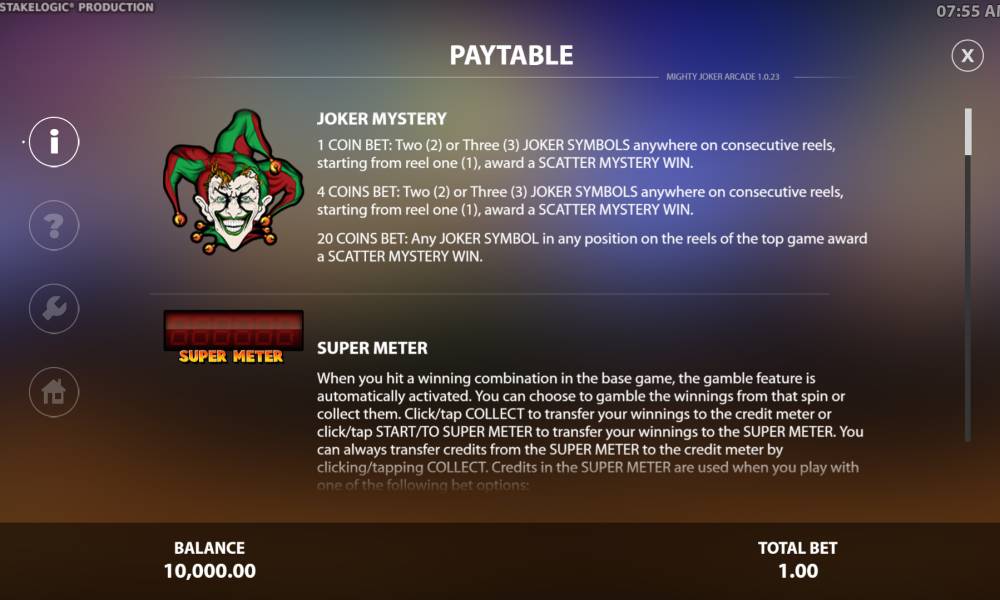 Игровой автомат Mighty Joker Arcade от провайдера Stakelogic выполнен на классическую тематику. Если вам повезет, то в этом слоте вы можете выиграть до 12000 ставок. В этом слоте также есть особые функции, которые могут принести крупный приз.