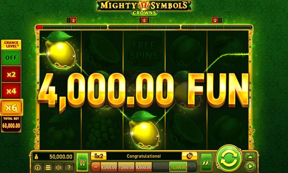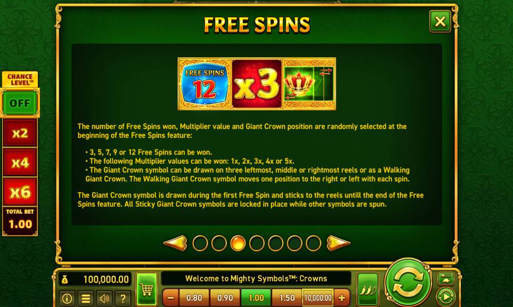 В слоте Mighty Symbols: Crowns есть бонусная игра с бесплатными вращениями. Активируется она при выпадении трех Scatter символов на барабанах 1, 3 и 5. Перед началом фриспинов случайным образом определяется их количество. Их может быть 3, 5, 7, 9 или 12. Также рандомным способом определяется множитель фриспинов, он может быть 1х, 2х, 3х, 4х или 5х. Расположение гигантского Crown Wild символа может появиться на барабанах 1-3, 2-4 или 3-5, а также может перемещаться по этим позициям с каждым вращением.