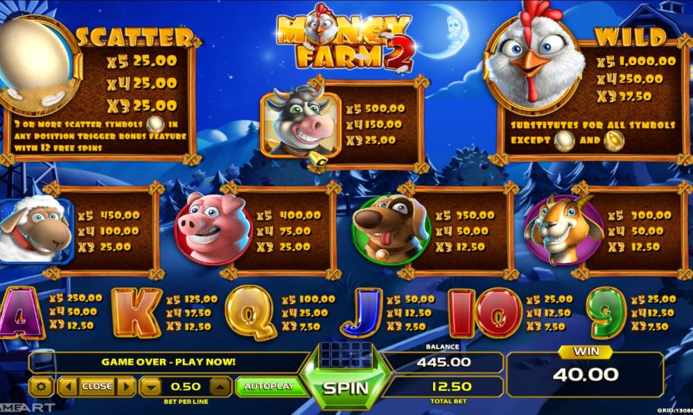 Игровой автомат Money Farm 2 состоит из пяти вращающихся барабанов с разнообразными картинками. На экране символы располагаются в три ряда. Равные ставки принимаются на двадцать пять фиксированных линий. В демо-версии от производителя на каждую разрешается ставить от 0.01 до 0.50 долларов (0.25 – 12.50 долларов на спин). В слот-машине «Денежная ферма 2» есть простые символы, джокеры, скаттеры, игра на удвоение, а также бонусный раунд в виде фри-спинов с несколькими экранами и дополнительными призами. Стандартные изображения формируют выигрышные цепочки лишь на задействованных полосах. Несколько элементов одного типа должны выстроиться слева направо, стартуя с первой колонки. Допускаются многочисленные выплаты в одном пуске барабанов, но с каждой позиции деньги начисляются только за наиболее ценный вариант. Выигрыши рассчитываются по ставке на линию и коэффициенту от х15 до х1000. Эти показатели умножаются друг на друга, а при нескольких комбинациях кредиты суммируются. Начисленные деньги можно забрать или поставить на кон в игре по равным шансам, где нужно угадывать цвет закрытой карты. Если вам это удастся, выплата удвоится. Иначе вы лишитесь ставки. Подряд можно действовать до пяти раз. Все исключения из правил Money Farm 2 и доступные бонусы рассматриваются далее в обзоре слота.
