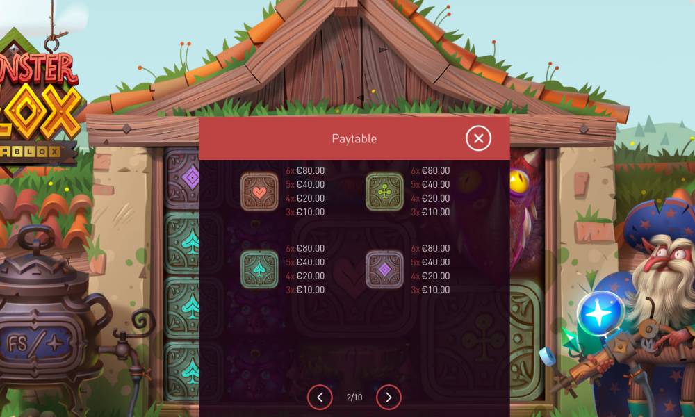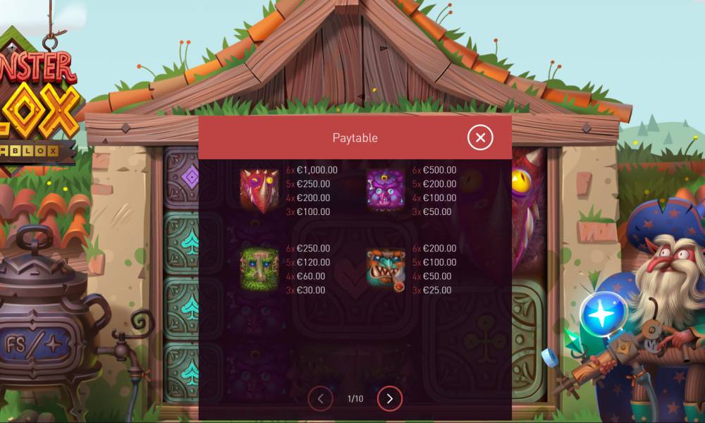 Monster Blox — это слот с 6 барабанами и 4 рядами, которые могут расширяться до 8 рядов. Игровое поле начинается с 40 выигрышных линий, увеличивающихся до 100 линий. Комбинации формируются слева направо, начиная с первого барабана. Размер ставок — от 20 до 10 000 монет за одно вращение. Максимальный выигрыш достигает 7500x от ставки. В игре доступна риск-игра, а также множество бонусов и фриспинов, которые делают процесс еще интереснее.