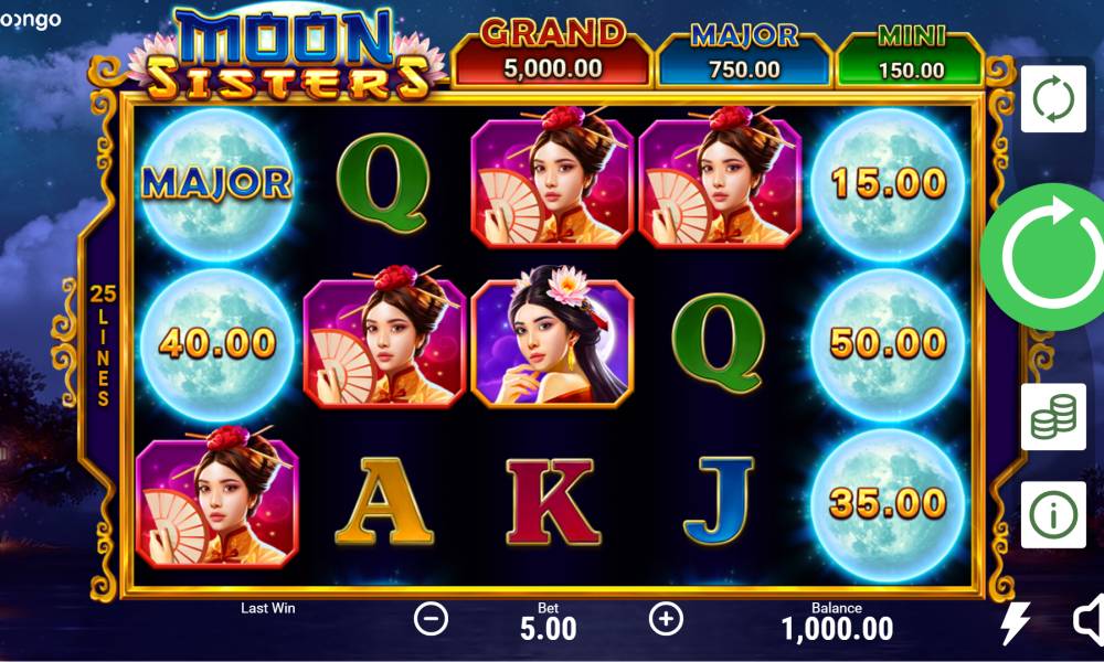 Игровое поле слота Moon Sisters от компании Booongo стандартное. Оно состоит из 5 барабанов по 3 символа в каждом. Выплаты производятся по 25 фиксированным линиями.