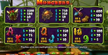 Munchers – видео-слот с пятью барабанами и тремя рядами символов на экране. Играть на игровом автомате можно по ставке на линию от одного цента до двух евро, а на спин принимается до пятидесяти евро. В этой модели есть особые символы с необычными возможностями, бесплатные запуски, рискованная игра по шансам и другие функции.