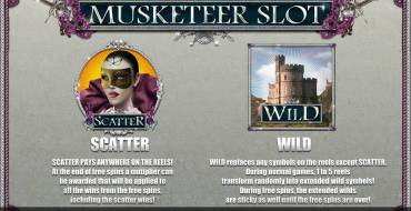 В игре пять барабанов и пятнадцать картинок на основном экране. Ставки одинакового размера принимаются на одну, пять, десять, пятнадцать или двадцать линий. По каждой из позиций можно ставить до пяти монет достоинством 0.01, 0.02, 0.05, 0.10, 0.25, 0.50 или 1 евро. Так что на раунд принимается от одного цента до ста евро. Игра имеет базовые и особые картинки, раунд бесплатных спинов с увеличенными коэффициентами, а также дополнительные бонусные опции. Все они рассматриваются ниже. Простые изображения приносят выигрыши, образуя на активных линиях комбинации. Таковыми являются непрерывные цепочки, составленные из трех, четырех или пяти одинаковых элементов. Располагаться они должны, начиная с первой колонки слева. Не забывайте, что выплата начисляется лишь за самую длинную последовательность по каждой позиции, хотя по разным полосам в одном раунде может быть сразу несколько выигрышных вариантов. Скаттеры действуют несколько иначе, но о них читайте в следующем разделе. Расчет выигранной суммы производится по двум параметрам: ставки на линию и коэффициента сформировавшейся комбинации, который бывает от х5 до х1000. Они умножаются друг на друга. Если цепочек несколько, все начисленные кредиты складываются. Игры по шансам здесь нет, поэтому деньги, начисленные по результатам спина, выводятся на счет сразу после остановки барабанов. Мы не нашли информации о заложенном в «Слот мушкетера» уровне теоретического возврата.