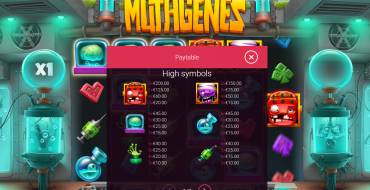 Mutagenes — это видеослот с игровым полем 6х4 и 4096 способами выигрыша. Выигрышные комбинации формируются при совпадении одинаковых знаков слева направо. Диапазон ставок — от 10 до 5000 монет за одно вращение. В игре также доступны каскадные выигрыши с растущим множителем. Максимальный выигрыш — будет 12000x от ставки.