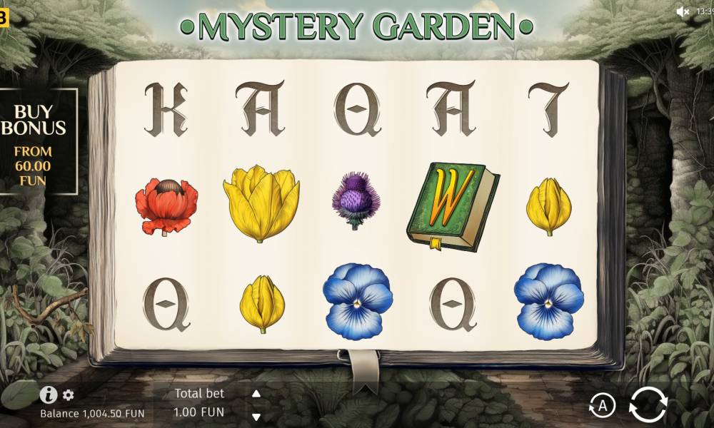 Интерфейс Mystery Garden очень прост. Стрелочки вверх и вниз отвечают за выбор размеров ставки. Под шестерней скрывается раздел системных настроек. Кнопка "i" предоставит информацию о правилах и таблице выплат. Меню покупки бонуса находится слева от игрового поля, а в правом нижнем углу расположились кнопки запуска. Для запуска игры требуется: