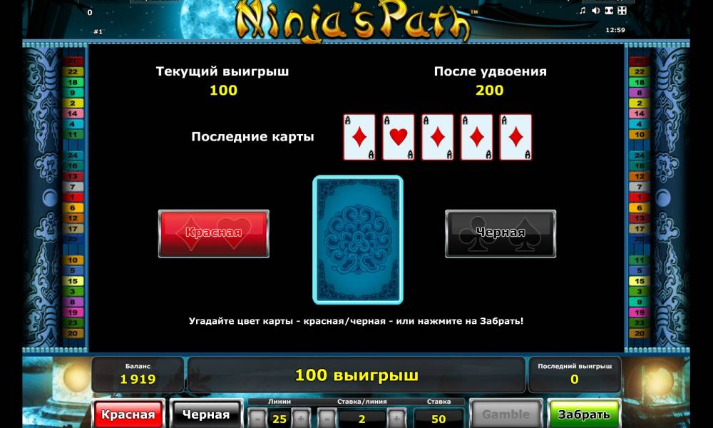 В Ninja’s Path пять барабанов, три ряда картинок на экране и двадцать пять линий. Клиент может задействовать любое количество полос из числа предлагаемых. Набор доступных опций геймплея состоит из базовых картинок, особых символов, бесплатных вращений с более выгодными условиями, дополнительных множителей и раунда на удвоение. Ставки по активным линиям всегда равны. Их размер определяется пользователем из диапазона от двух до четырехсот кредитов по каждой позиции. Таким образом, на раунд принимается до десяти тысяч условных единиц в выбранной валюте. Цель – получение выплат по комбинациям, которые представляют собой непрерывные цепочки одинаковых символов, оказавшихся на задействованной полосе, начиная с первого барабана. Лишь самая длинная последовательность по отдельной взятой позиции считается выигрышной. На разных полосах в одном спине может быть до двадцати пяти оплачиваемых вариантов (не считая выигрышей за скаттеры, о которых рассказывается ниже). Минимальное количество картинок, требуемых для формирования цепочки, равно двум или трем, что зависит от типа. Выплаты рассчитываются умножением ставки по линии на коэффициент комбинации (от х2 до х6000). Если последовательностей несколько, выигрыши суммируются. Клиент может забрать деньги сразу или попытаться увеличить общую выплату в игре на удвоение, выполненной в традиционном виде. Ему нужно угадывать цвет закрытой карты. Верный ответ увеличивает сумму в два раза. Ошибка означает проигрыш. Допускается несколько раундов в одном подходе. Данных о теоретическом возврате у нас нет.