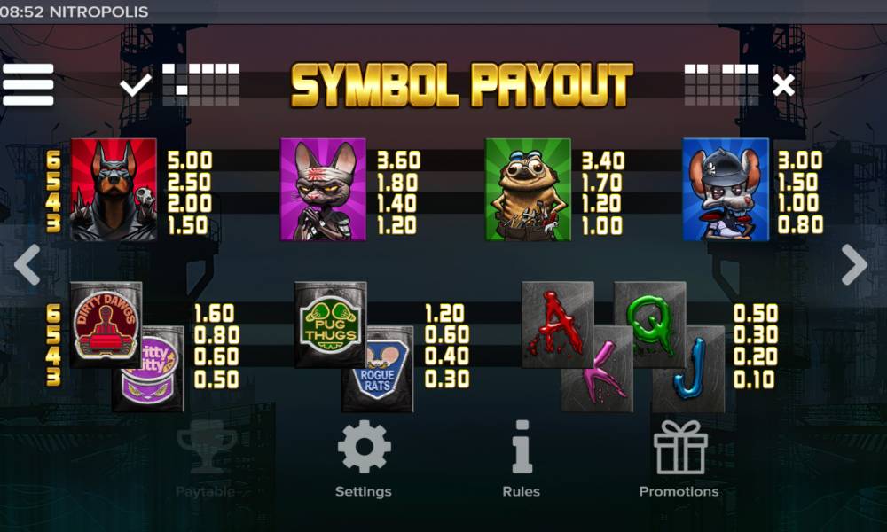 В Nitropolis mobile slot правила идентичны тем, что действуют в варианте для настольных компьютеров. Интерфейс практически такой же. Доступны настройки, раздел правил, таблица выплат, автоматический режим, системы ставок и другие возможности.