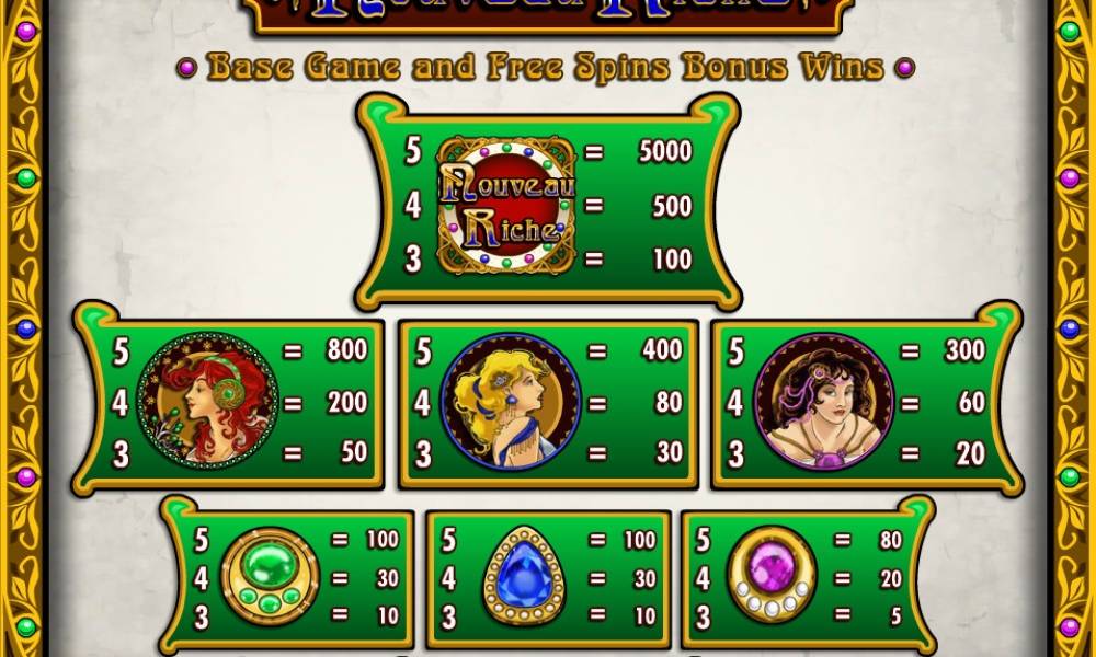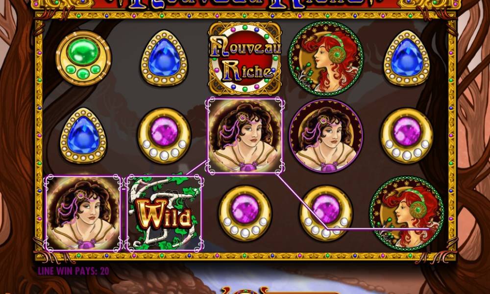 На барабанах видео-слота вы увидите изображения богато одетых женщин (по мнению авторов игры, муз) и разнообразные драгоценности. В игре также есть специальные символы Wild и Bonus. Wild не оплачивается отдельно, однако заменяет в комбинациях другие картинки (кроме бонусной). Wild идет полосами и может занимать три позиции по вертикали на экране Nouveau Riche, однако увидеть его можно лишь на трех средних барабанах. Bonus выпадает на первом, втором и третьем барабанах. При одновременном появлении трех таких символов начинается раунд бесплатных спинов. Вам нужно будет выбрать одну из женщин, чтобы узнать их количество. Игра будет идти по последней ставке. Во время этих вращений выпадает больше стекированных Wild. На третьем барабане может появляться символ +1, который добавляет один спин. Всего их может быть не более ста в одном раунде. Игра также может завершиться, если вы доберетесь до максимума суммарной выплаты, который устанавливается по ставке.