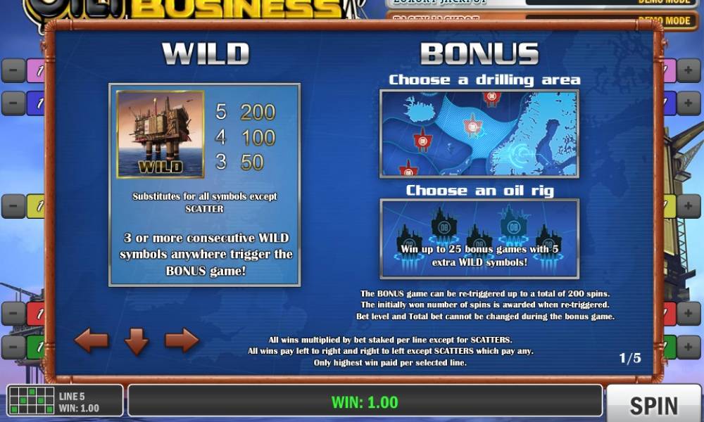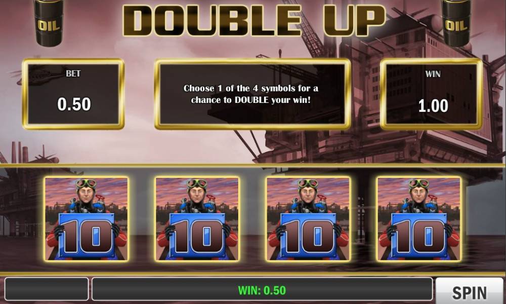 Призовой раунд начинается с того, что вы должны выбрать наугад одну из предлагаемых локаций на карте, а затем указать на одну из доступных нефтяных вышек. Так вы определите количество полагающихся фри-спинов и действующих в них дополнительных символов Wild. Затем начнутся бесплатные вращения, которые могут продлеваться до двухсот подряд.
