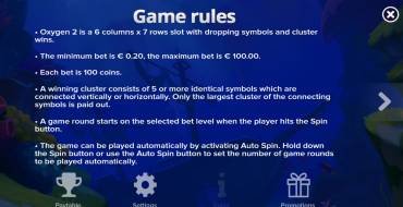 В онлайн слоте Oxygen 2 6 барабанов по 7 рядов. Такое большое поле предполагает возможность сбора длинных цепочек — 5+ одинаковых символов, соприкасающихся ребрами. Такая механика называется Cluster Pays. Игра использует 3 младших и 4 старших вида знаков, это осьминоги, рыбы, улитки и т.д. Пользователей ждут обычные и суперфриспины, множители, специальные выделенные ячейки, взрывающиеся символы и покупной бонус нескольких видов. Ставку на спин можно выбирать от 0.2 до 100 евро. Максимальный выигрыш достаточно крупный. Он составляет х25000 от ставки.