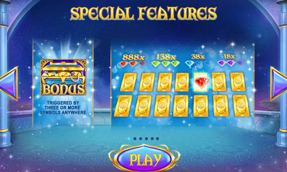 Magic Carpet Bonus – На дополнительном экране появляются волшебные ковры. Их можно выбирать в произвольном порядке, собирая драгоценные камни. Когда будут накоплены три одинаковых самоцвета, игрок получит выплату, соответствующую данной комбинации. Она рассчитывается по ставке и множителям от х18 до х888.