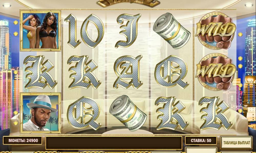 Темнокожие парни в белых костюмах и шляпах, красавицы в бикини, скрученные резинками доллары, золотой перстень с многочисленными бриллиантами, а также украшенные драгоценными камнями номиналы игральных карт – такие символы можно увидеть в игровом автомате «При бабле». Особыми возможностями наделены элементы Wild (золотой кастет в виде этого слова) и Scatter (кулон с знаком доллара). Рассмотрим их функции: