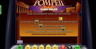На каждый раунд можно поставить 25, 50, 75, 100 или 125 кредитов номиналом от двух центов до одного доллара. Так что играть на игровом автомате Pompeii разрешается не более чем по ста двадцати пяти долларам на раунд.