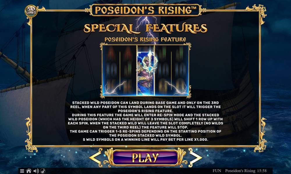 | Бонусные игры | Extra Wilds, Expanding Wilds, Free Spins Journey, Buy Feature, Poseidon's Rising Feature, Winning Symbols Re-Spin, Shifting Wild |