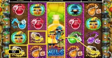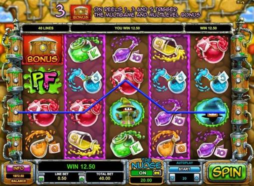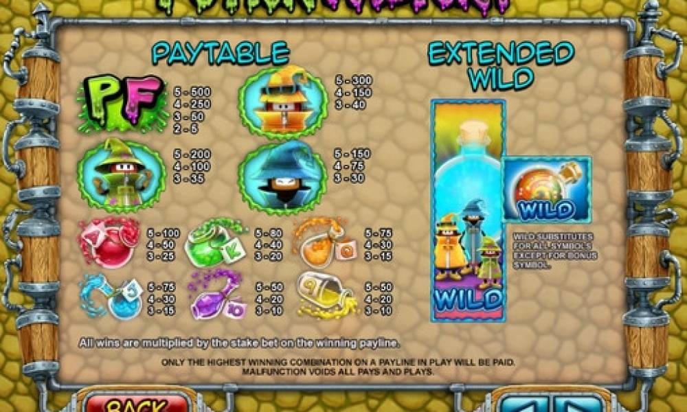 Potion Factory – пятибарабанный видео-слот с расположением символов на экране в четыре ряда. В нем сорок линий, и все они постоянно активны. На линию принимается ставка в диапазоне от одного до пятидесяти центов. Соответственно, на спин можно поставить до двадцати долларов. Если же активировать функцию The Nudge (читайте о ней ниже), ставка увеличится в два раза. В игровом автомате Potion Factory, помимо вышеупомянутой функции The Nudge, есть специальные символы, бонусный раунд по теме слота, бесплатные спины и другие опции. Когда в игре включена The Nudge, два барабана могут, после того как завершится спин, сдвинуться на одну, две или три позиции, что приводит к образованию новых комбинаций. Участвуют в этом процессе лишь второй и четвертый барабаны. Смещаются они лишь в том случае, если это может помочь сформировать комбинацию. Выигрышные комбинации в видео-слоте Potion Factory образуются по классическим принципам, означающим, что от двух одинаковых картинок должны оказаться рядом на активной линии, начиная с первого барабана. Как обычно, на линии оплачивается только старшая комбинация, а все выигрыши суммируются. Сумма выплаты рассчитывается умножением ставки по линии на коэффициент комбинации (до х500). Общий выигрыш за спин сразу переводится на счет клиента, потому что рискованной игры по шансам в Potion Factory нет. Информацией о теоретическом возврате видео-слота Potion Factory мы не располагаем.
