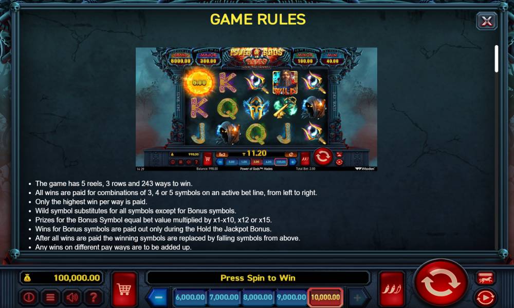 В слоте Power of Gods: Hades игроки могут ожидать захватывающий игровой процесс с разнообразными элементами, которые делают его уникальным. Основная раскладка символов включает в себя мифологические элементы и традиционные карточные знаки, каждый из которых имеет свои выплаты. В игре присутствует символ Wild, представляющий Хадеса, который заменяет все обычные символы, помогая формировать выигрышные комбинации. Однако сам по себе символ Wild не приносит выплат, что делает его вспомогательным элементом. В слоте Power of Gods: Hades используется макет с 5 барабанами и 3 рядами. Игра предлагает 243 линии выплат, что дает игрокам множество возможностей для формирования выигрышных комбинаций.