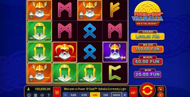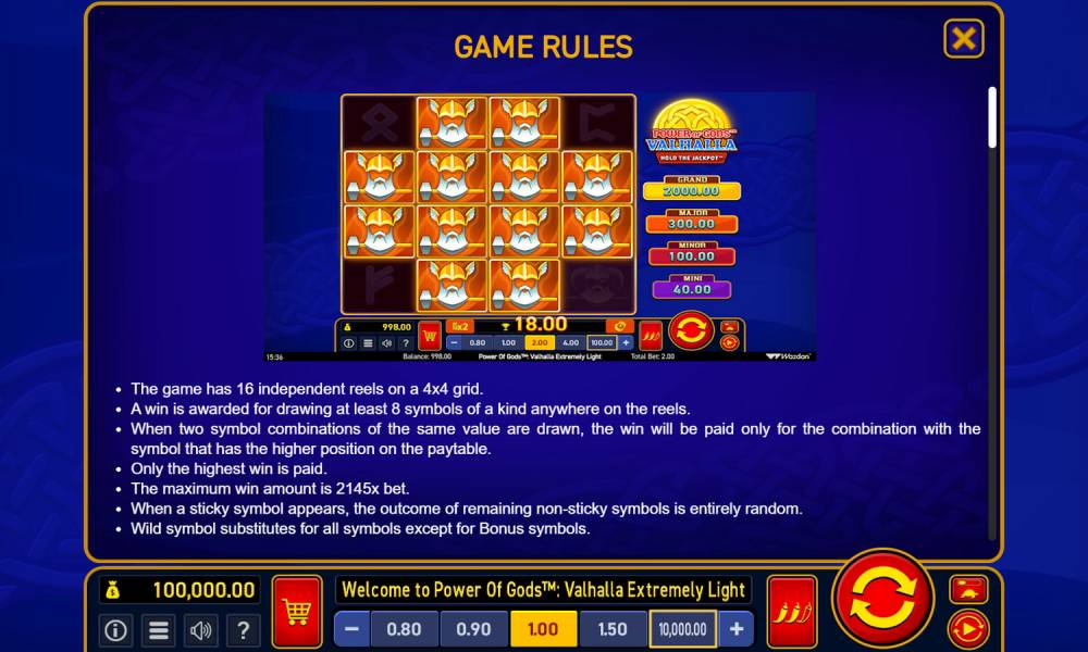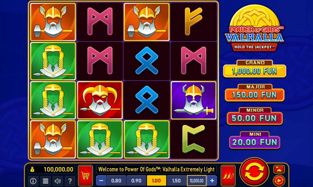 В слоте на 4 барабана Power of Gods: Valhalla Extremely Light от Wazdan используется игровое поле 4х4, с известной системой выплат Pay Anywhere. Диапазон ставок варьируется от 0,2 до 10 000 монет. Это означает, что выигрышные комбинации могут формироваться, когда на экране выпадает от 8 до 16 одинаковых символов в любой позиции. Важным элементом являются бонусы: при выпадении 6 и более бонусных символов запускается функция Hold the Jackpot, где можно выиграть до 2145x от ставки.