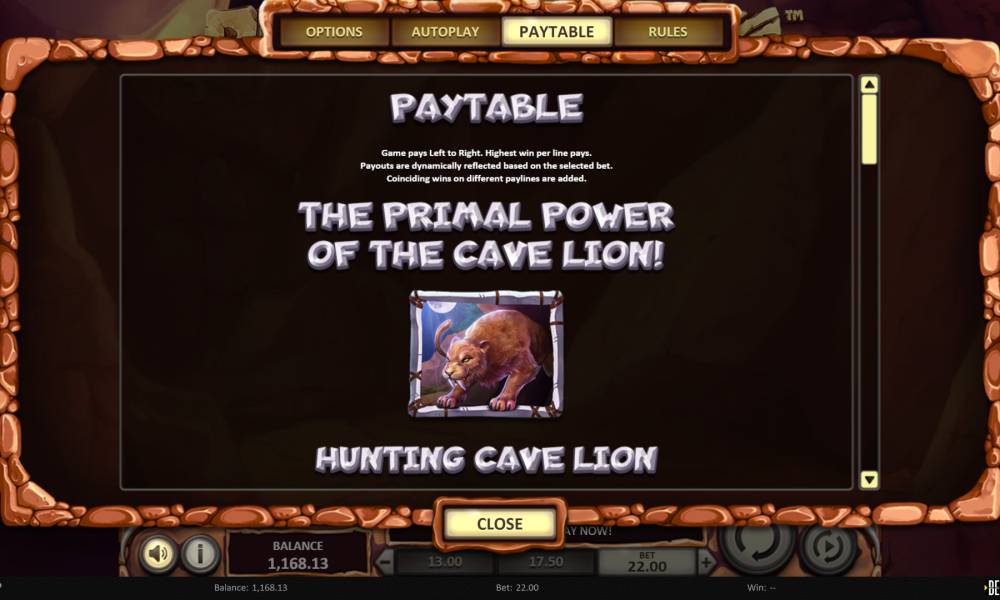 • Scatter (пещерный лев) не зависит от расположения на экране. Минимум три скаттера, оказавшихся в любой позиции, начинают бесплатные вращения. Также они дают выигрыши, которые рассчитываются по общей ставке.