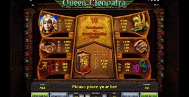 В игровом автомате «Царица Клеопатра» пять барабанов, на которых изображены символы десяти видов. Они составляют комбинации, а также запускают бонусные вращения. Задействовать можно одну, три, пять, семь или десять активных полос, на которые разрешается делать одинаковые ставки: от четырех до одной тысячи монет на каждую. Картинки на экране выстраиваются по сетке 5х4. Помимо базовых иконок, задействован джокер/скаттер. Также доступны фри-спины с призовыми функциями. Оплачиваемые последовательности составляются на используемых линиях. Правила образования традиционные. Это должна быть непрерывная цепочка минимум из двух или трех одинаковых иконок, начинающаяся с первого столбца слева. Выплат может быть несколько в одном спине, но по каждой позиции учитывается лишь старший вариант. Всем комбинациям присвоены коэффициенты от х5 до х5000. Они умножаются на ставку по линии. Раунда на удвоение в Queen Cleopatra нет. Деньги сразу выводятся на счет. О специальных символах и дополнительных возможностях читайте далее.