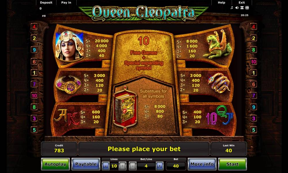 Лидером по количеству подобных моделей, безусловно, является компания Novomatic с ее бесконечными вариациями «Книги Ра», «Могилой фараона», «Оком Ра» и многими другими играми. Этот обзор посвящен новинке под названием Queen Cleopatra о могущественной правительнице Древнего Египта.