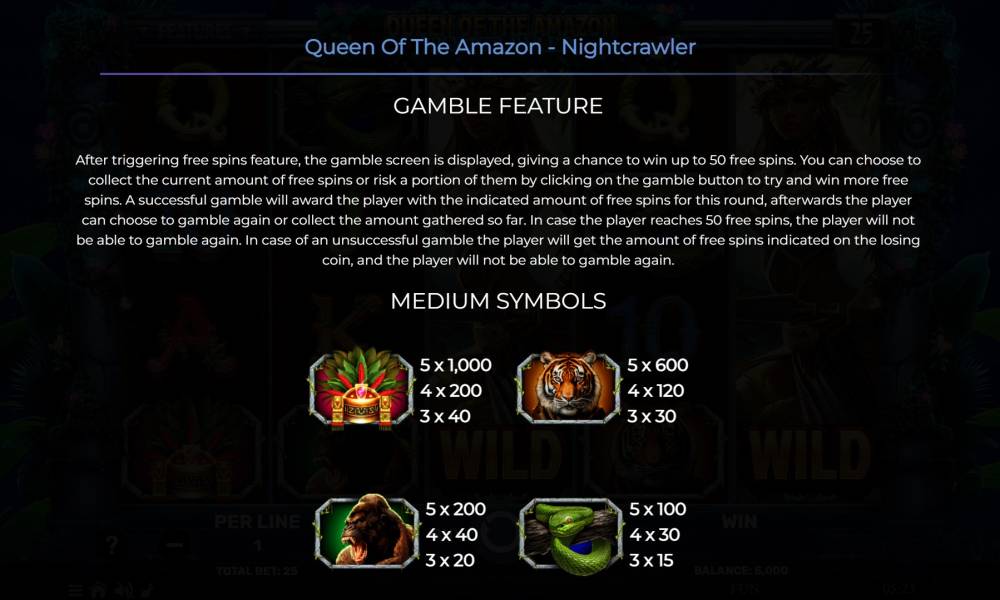 В Queen Of The Amazon – Nightcrawler довольно интересные бонусные события, но общий свод правил прост для изучения. Игровое поле состоит из стандартных 5 барабанов высотой в 4 ячейки. Ставка устанавливается из диапазона от 0.25 до 250 евро. В таблице выплат указано 9 символов, но в игре присутствует еще и 3 специальных знака.