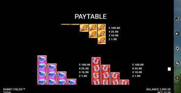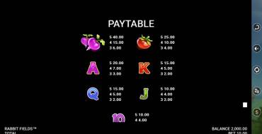 Rabbit Fields имеет поле 5х4 с 30 фиксированными линиями выплат. Размеры ставок находятся в пределах 0.2–50$. Лимит по выигрышу ограничен множителем х5000, которые можно урвать в джекпоте. Самих джекпотов несколько, разных размеров. Есть 2 отдельных бустера, фриспины и спецсимволы.
