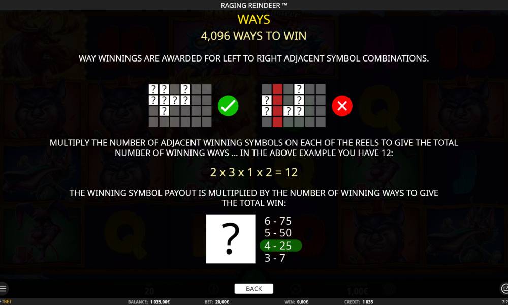 В слоте Raging Reindeer шесть барабанов и двадцать четыре ячейки для картинок на экране. Иконки выстраиваются в четыре ряда.