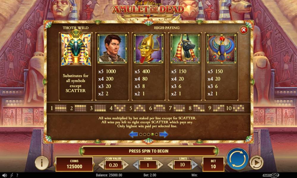 Игровое поле слота Rich Wilde and the Amulet of Dead от провайдера Play'n Go представлено классической сеткой 5x3. Все выплаты осуществляются по 10 линиям.