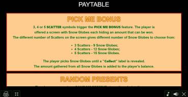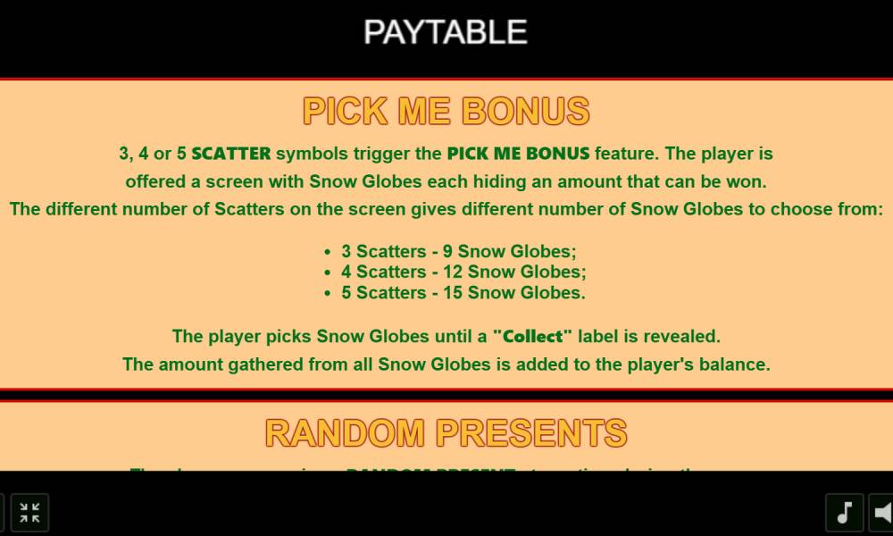 Pick Me Bonus. Когда на барабанах выпадают символы Scatter, запускается эта игра с денежными призами. За 3, 4 и 5 знаков пользователь получает возможность открыть 9, 12 и 15 снежных шаров соответственно. Он должен нажимать на них и забирать призы до тех пор, пока не попадет на надпись Collect.