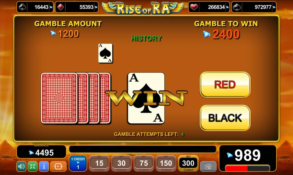 Во всех видео-слотах EGT, включая Rise of Ra, разыгрываются четыре прогрессивных джекпота, названных по карточным мастям. Побороться за них можно в специальном раунде. Он запускается случайным образом при игре на деньги. На дополнительном экране появляются двенадцать закрытых карт. Их нужно выбирать в произвольном порядке, накапливая открывающиеся масти. Когда у вас на руках окажутся три одинаковых значка, вы станете обладателем соответствующего джекпота.
