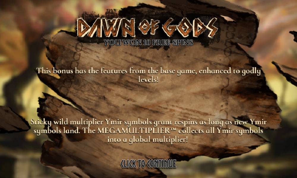 Рассвет богов (Dawn of Gods). При выпадении трех символов Scatter запускается бонусный раунд с десятью бесплатными вращениями, где повышена вероятность выпадения символов Имира с более высокими множителями. Дополнительные символы разброса в ходе раунда дают +2 или +4 спина соответственно за два и три скаттера.